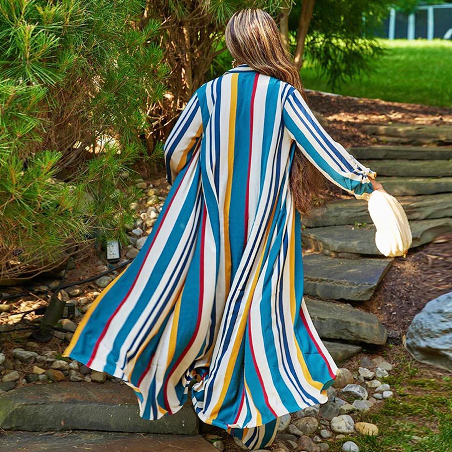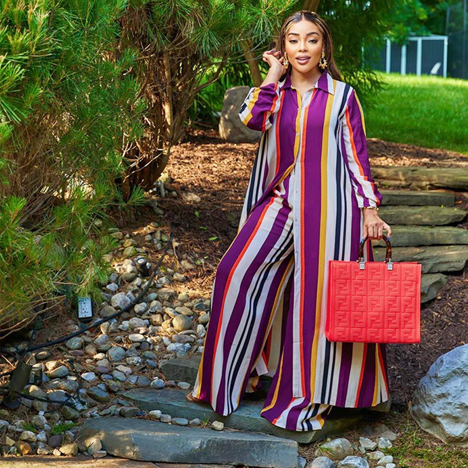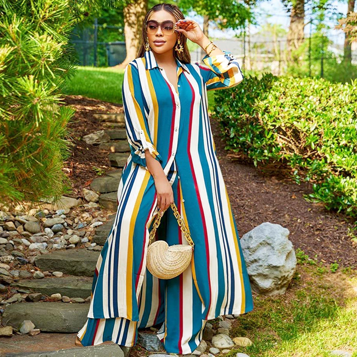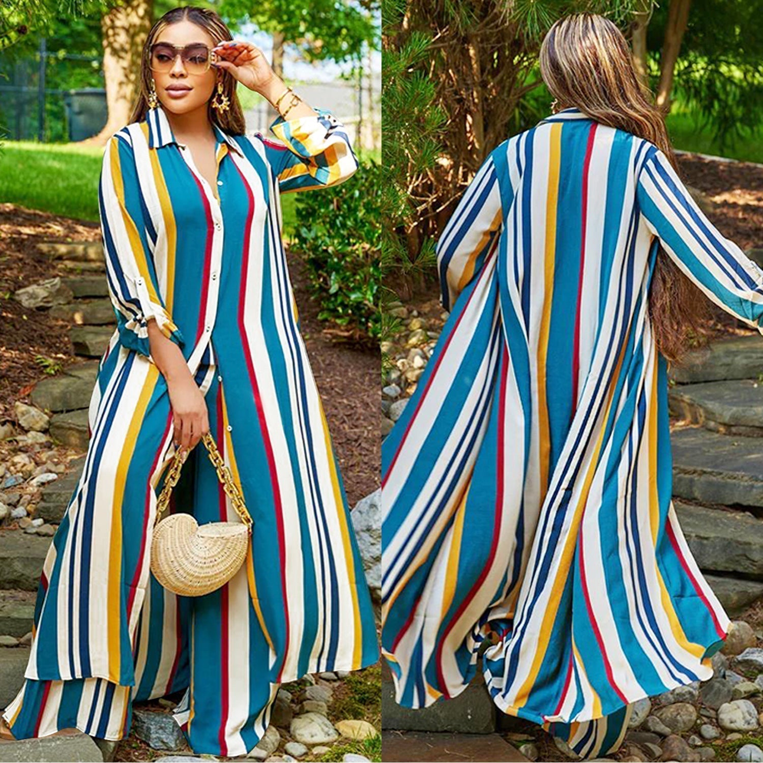Conjunto de 2 piezas para mujer: Maxi blusa a rayas de manga larga y pantalón