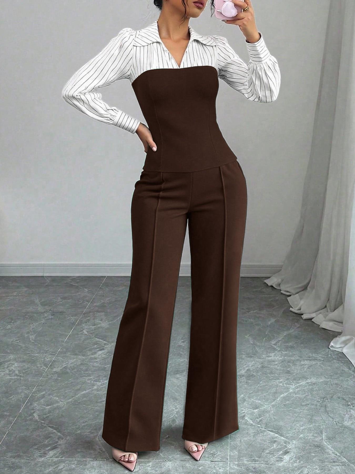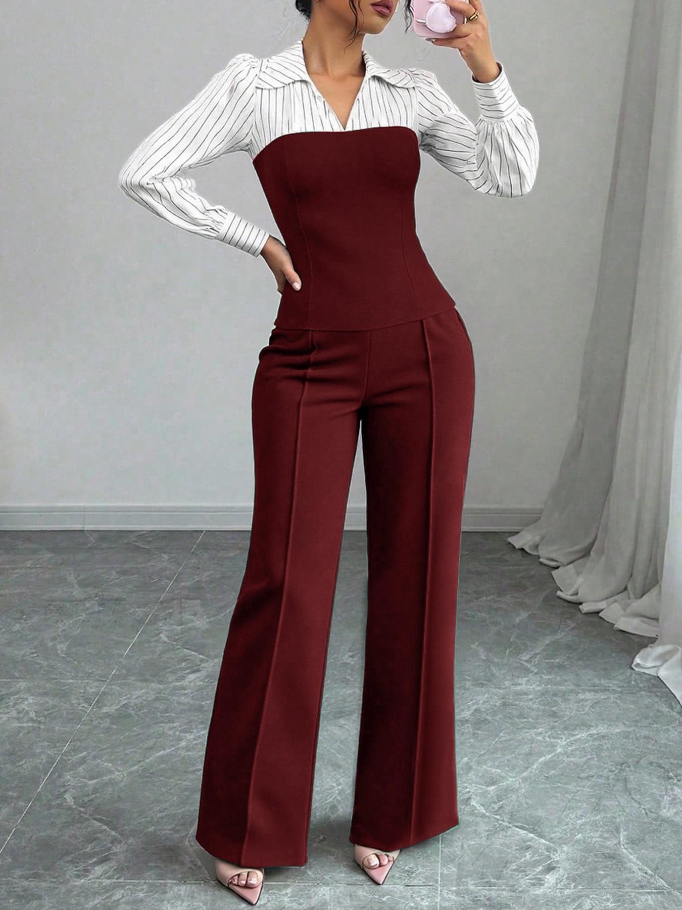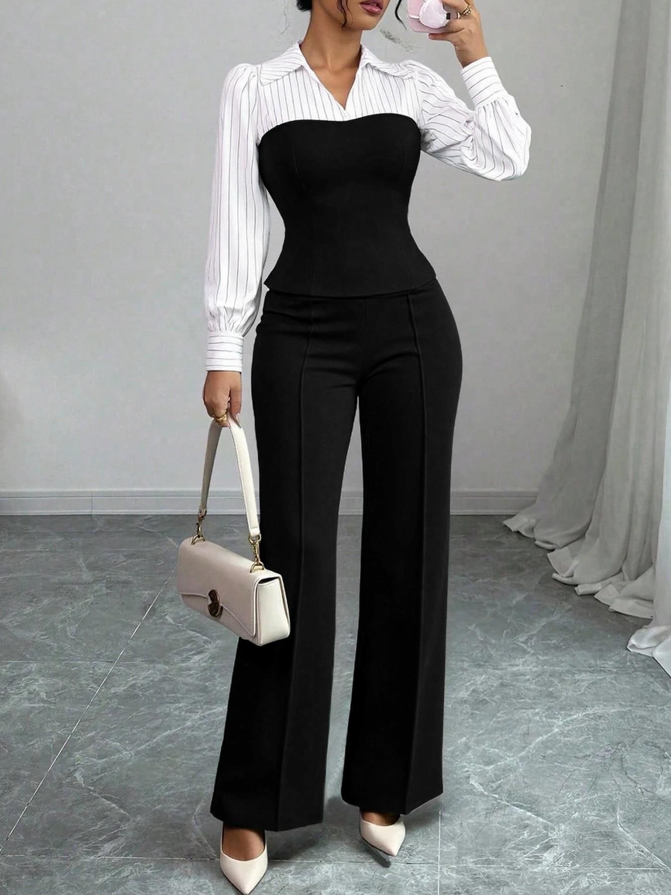 Conjunto Elegante de Blusa de Rayas con Escote en V y Pantalón de Pierna Ancha para Mujer